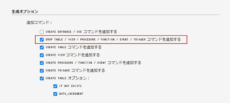生成オプションでは追加コマンドの上から2個目のチェックボックスに☑をいれる。