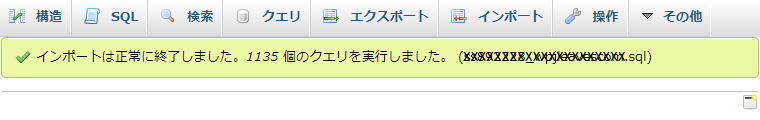インポートが終了すると上記のメッセージがでます。 たまに、タイムアウト等のエラーメッセージがでます。 その際は再度インポートします。 これでローカルサーバと新サーバに同じ内容のものが入ったことになります。