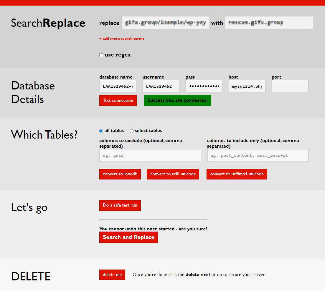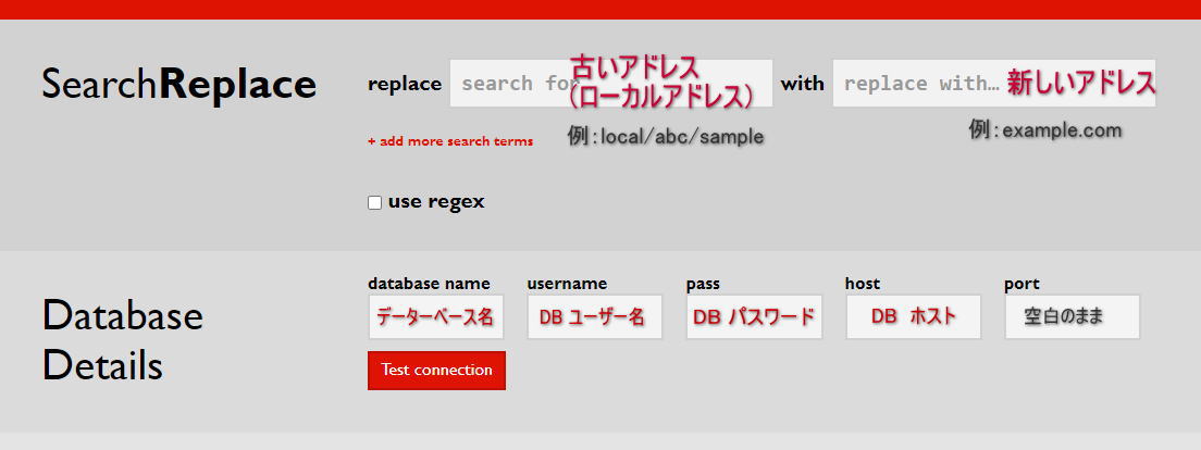 replaceの欄に旧サイトアドレス(今回はローカルアドレス)、withの欄に新しいアドレスを入れます。 Database Detailsに1.で設定した項目をいれます。 portの欄は空白のままでOK。