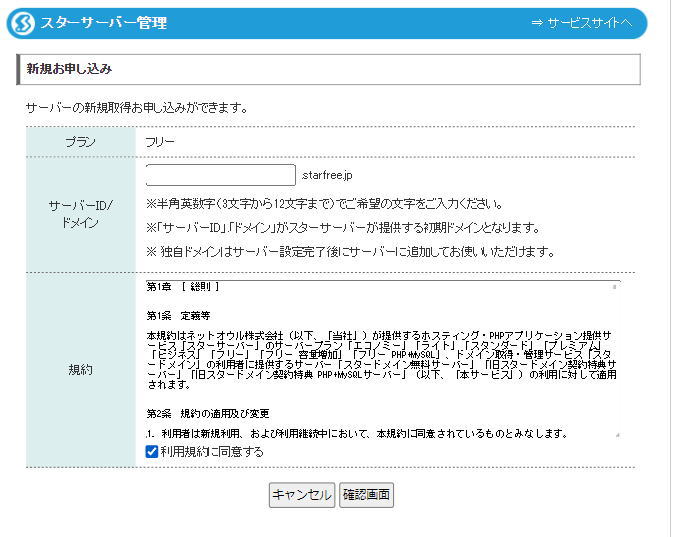 ではスターサーバー無料プランを契約します。(因みに解約は解約ボタンを押すだけで一発で解約できます。)