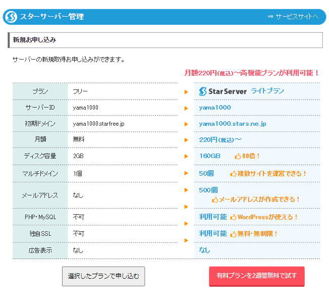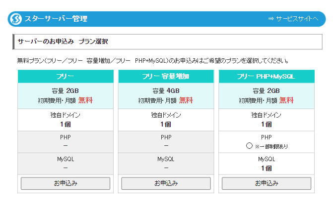 スターサーバー無料プランを契約します。 サービスが終了しない限り半永久的に無料でサーバーを持ち続けることができます。 ここでは邪魔な広告なしのフリープランを想定します。 ただしデメリットも少なくありません。
