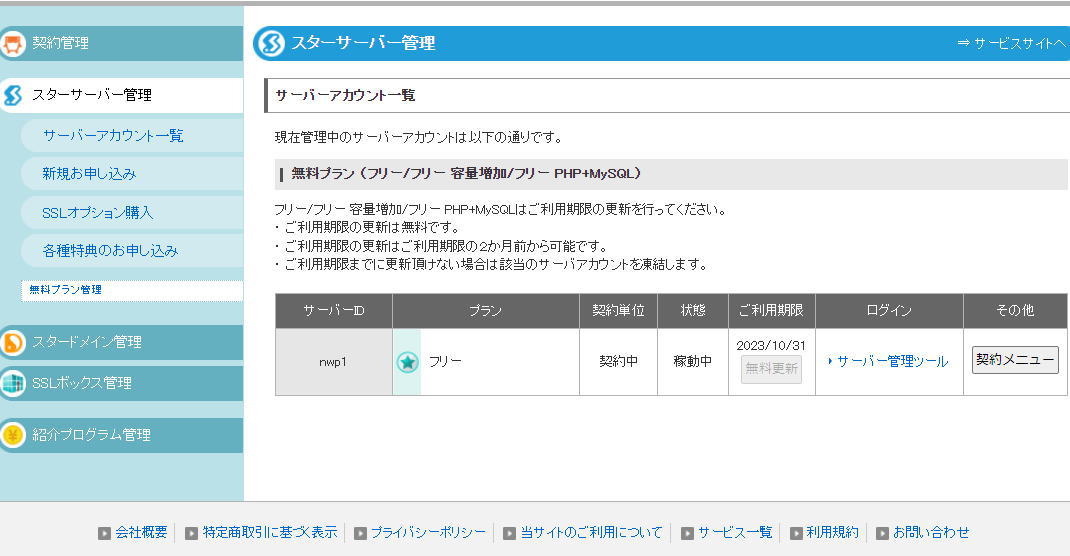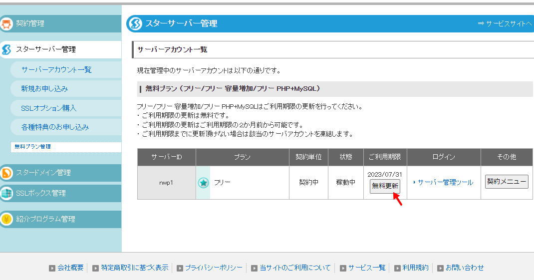 スターサーバにログインして「無料プラン管理」を押します。下記の画面が出たら「無料更新」ボタンを押します。